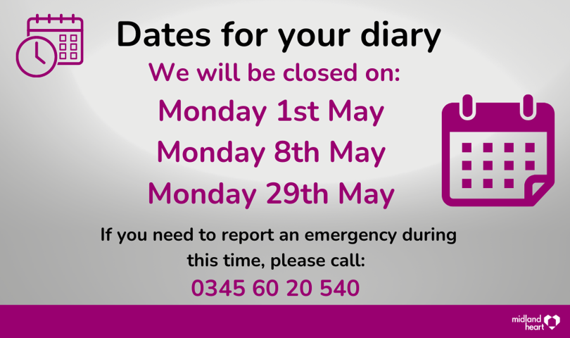 While our Customer Hub is closed you won’t be able to contact us about things like repairs or your rent account. However, you can still report emergencies to our out of hours service.